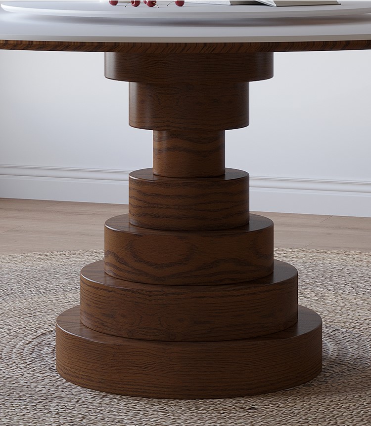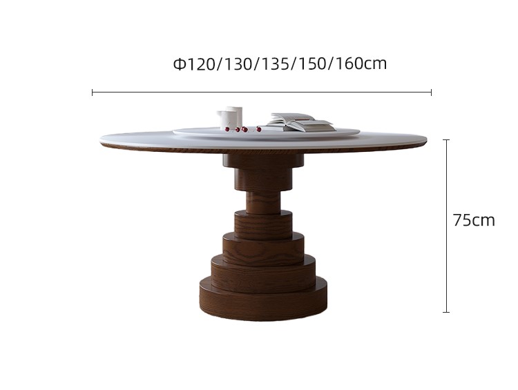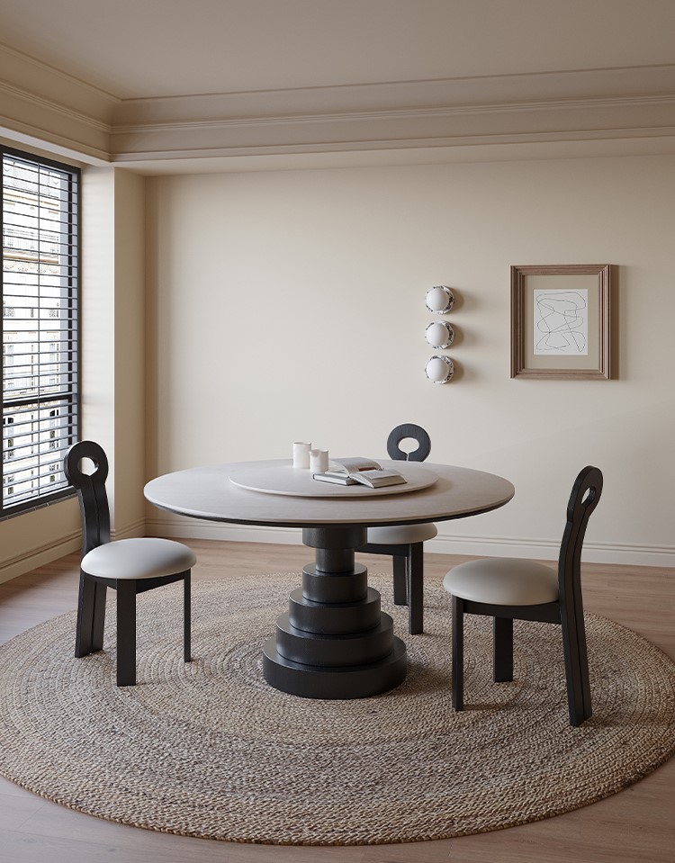 スレート石の天板を備えた丸い無垢材のダイニングテーブル